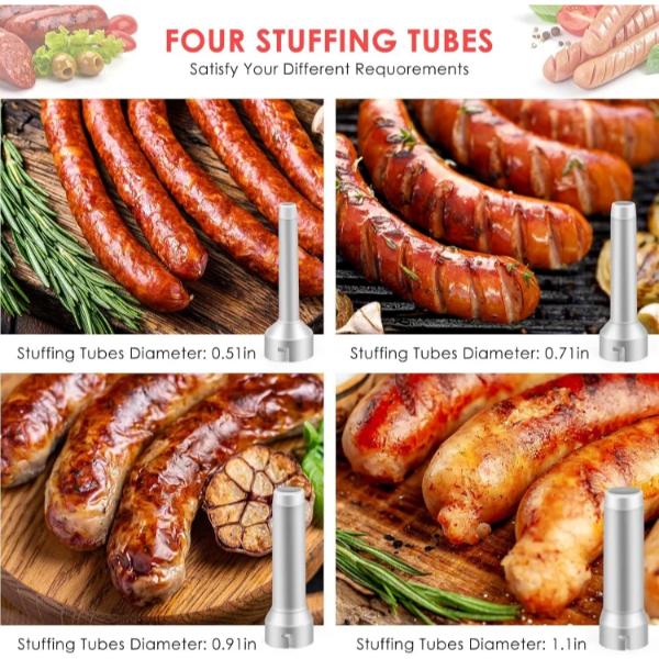 Αυτός ο γεμιστήρας λουκάνικων περιλαμβάνει τέσσερα ακροφύσια PP με διαφορετικές διαμέτρους: 1,3 εκ. 1,8cm, 2,3cm και 2,8cm.